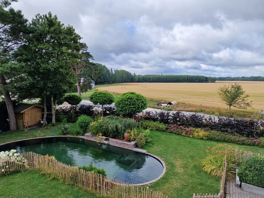 Notre souci était d'intégrer la piscine dans le jardin et la campagne environnante. Nous lui avons donc donné une forme de haricot, et avons choisi un liner noir lui donnant cette apparence d'étang plus que de piscine.